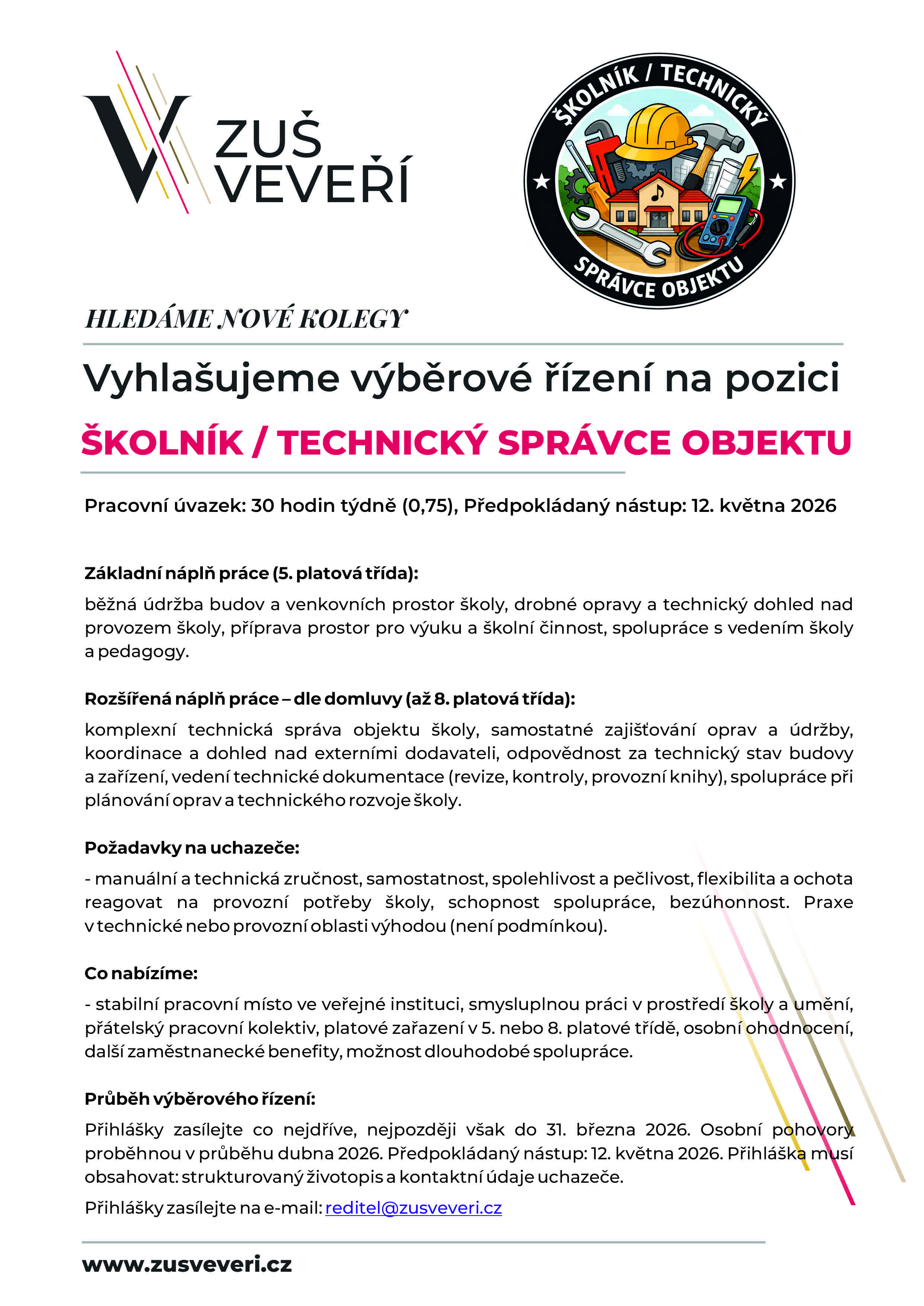 Přihlášky zasílejte co nejdříve, nejpozději však do 31. března 2026. Osobní pohovory proběhnou v průběhu dubna 2026. Předpokládaný nástup: 12. května 2026. Přihláška musí obsahovat: strukturovaný životopis a kontaktní údaje uchazeče. Přihlášky zasílejte na e-mail: reditel@zusveveri.cz