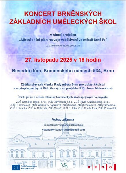 V rámci projektu "Místního akčního plánu rozvoje vzdělávání ve městě Brně IV" se bude dne 27. 11. 2025 v 18:00 hodin v Besedním domě konat Koncert brněnských základních uměleckých škol pod záštitou členky Rady města Brna pro oblast školství a místopředsedkyně Řídíciho výboru projektu JUDr. Ireny Matonohové.