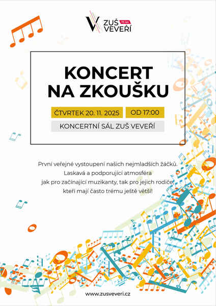 Přijďte se podívat na Koncert na zkoušku, který se koná dne 20. 11. 2025 v 17:00 v koncertním sále naší školy. Je to první veřejné vystoupení našich nejmladších žáčků, přijďme je proto podpořit a pomoct jim zbavit se trémy ze svého prvního veřejného vystoupení. Budeme se na vás těšit.