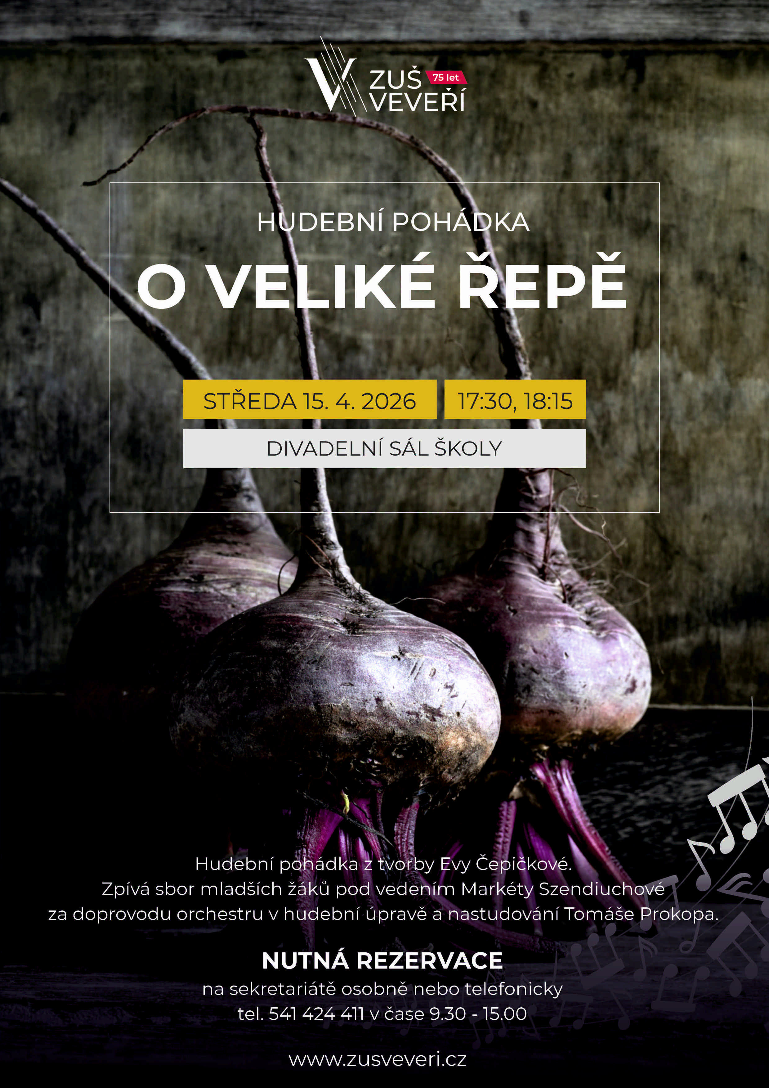Srdečně vás zveme na dětskou hudební pohádku O VELIKÉ ŘEPĚ. Eva Čepičková, která ji napsala, je oblíbenou autorkou hudby pro děti. Účinkuje dětský pěvecký sbor a orchestr dětí ZUŠ Veveří. Začátek v 17.30 a 18.15 hodin v divadelním sále školy. Lístky si, prosím, rezervujte předem na sekretariat@zusveveri.cz. Děkujeme a budeme se moc těšit.