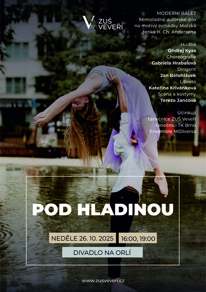 Srdečně vás zveme na nádherný balet Pod Hladinou v podání špičkových mladých tanečnic a tanečníků. V představení v choreografii paní učitelky Gabriely Hrabalové zazní hudba Ondřeje Kyase v podání našeho orchestru Ensemble MiDiversa vedeného panem učitelem Janem Bělohlávkem. Představení proběhne ve dnech 25. a 26. 10. 2025 v 16:00 a v 19:00 hodin v Divadle na Orlí. Budeme se na vás moc těšit.